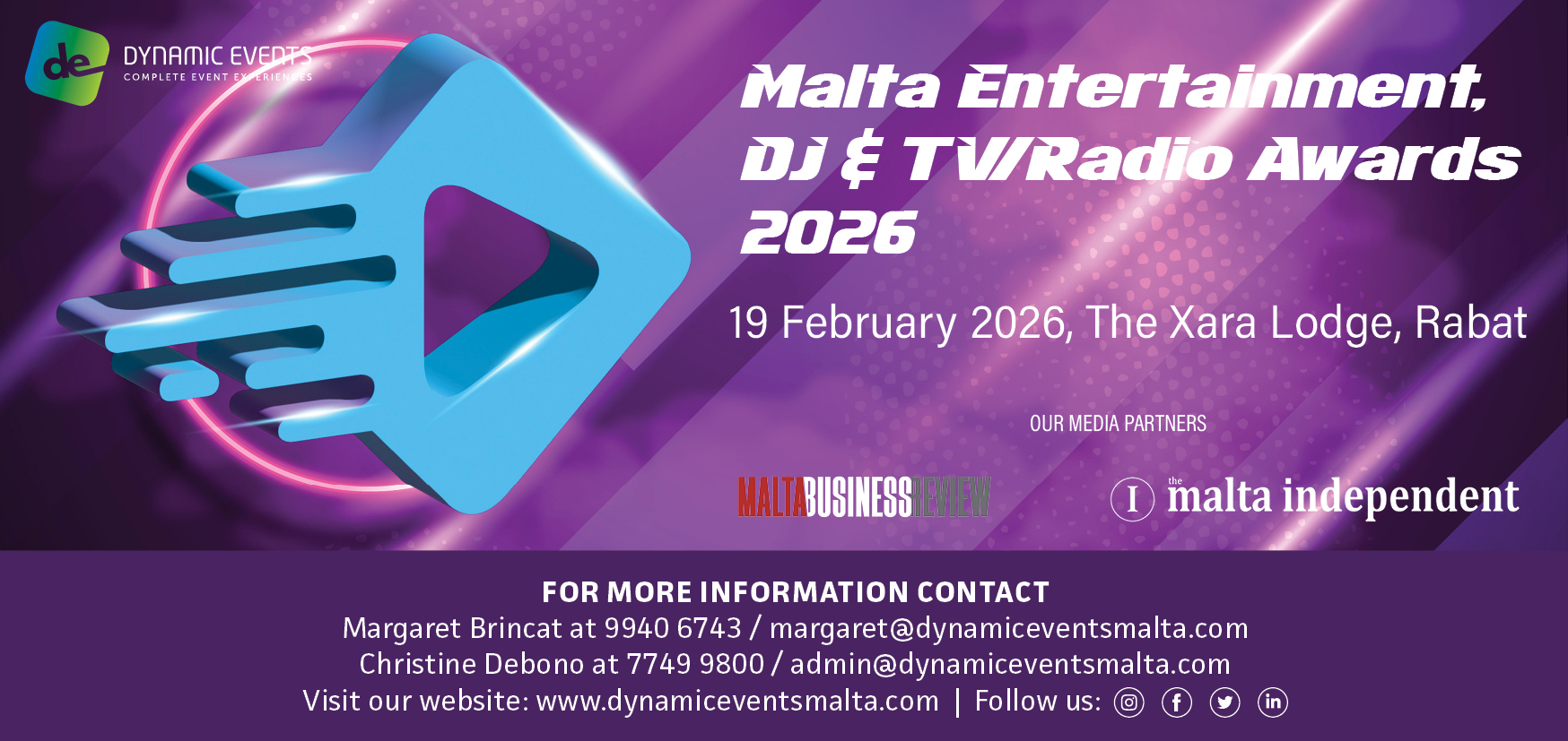 Margaret Brincat at 9940 6743 / margaret@dynamiceventsmalta.com